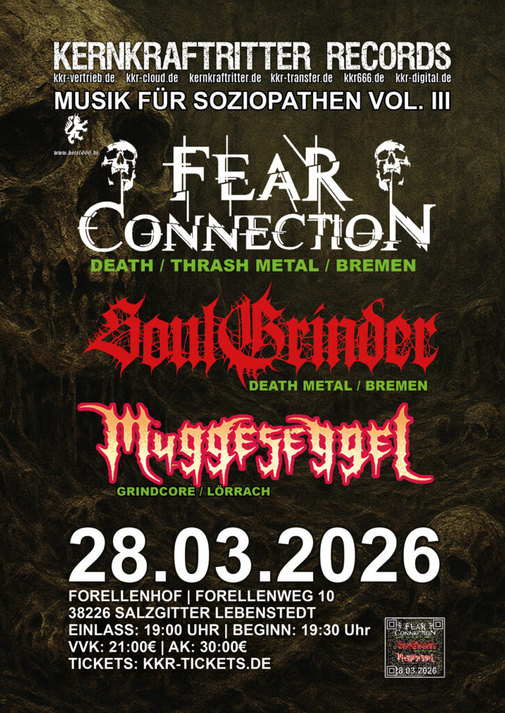 Bald ist es soweit und wir starten Musik für Soziopathen Vol.III im Forellenhof in Salzgitter, mit dabei sind Muggeseggel und Soul Grinder und Fear Connection Hier gibt es Tickets: https://www.kkr-tickets.de/de/event/musik-fuer-soziopathen-vol-iii Die Tickets bekommt ihr als PDF zugeschickt, druckt die aus oder zeigt uns die an der Kasse auf eurem Smartphone.