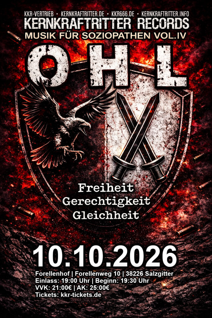 Es ist zwar noch etwas hin aber am 10.10.2025 spielen OHL in Salzgitter im Forellenhof, eine facebook Veranstaltung gibt es bereits Musik für Soziopathen Vol.IV – OHL live in Salzgitter Tickets kann man bereits erwerben bei KKR Tickets: https://www.kkr-tickets.de/de/event/musik-fuer-soziopathen-vol-iv Ihr bekommt dann das Ticket als PDF zum ausdrucken oder zeigt es uns an der... Read More