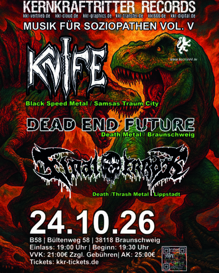 Bald spielen Musik für Soziopathen Vol. V – Knife / Final Error / Dead End Future im wunderschönen B58 – Braunschweigs behänder Live-Club! KNIFE und Final Error und Dead End...