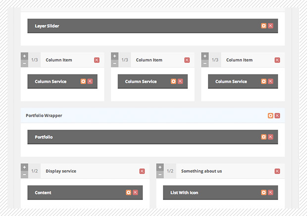 We breaks page item into 3 types. Column Wrapper Item, Content/Post Type Item, Media Item.